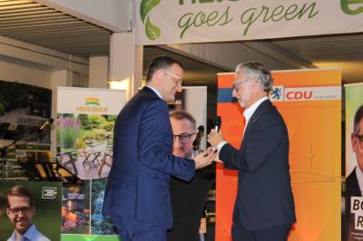 Zuvor hatte der Geschäftsführer der Firma Heissner, Rolf Papenheim, in einem flotten Beitrag die über 150jährige Geschichte des Unternehmens, das auch der Erfinder des Gartenzwergs ist, erläutert. Daher gab es für den Berliner Spitzenpolitiker aus dem früher „Zwergenfabrik“ genannten und heute weltweit operierenden Unternehmen der Wassergärten- und Gartengestaltung einen Keramik-Zwerg aus dem Jahre 1980, dem Geburtsjahr von Jens Spahn.